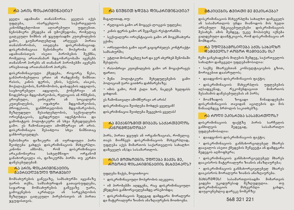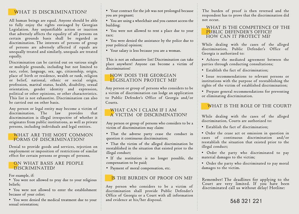 იმისათვის, რომ საქართველოს მოსახლეობას მის გაცნობასთან დაკავშირებით პრობლემები არ შექმნოდა, ლიფლეტი მრავალენოვანია: ქართულ, სომხურ, აზერბაიჯანულ, ინგლისურ და რუსულ ენებზე. მასში საუბარია დისკრიმინაციის არსზე, მის ფორმებზე, მის მექანიზმებზე საქართველოს კანონმდებლობაში, აგრეთვე, დისკრიმინაციის მსხვერპლთათვის მოცემულია საჭირო და სასარგებლო მასალა და ცხელი ხაზის ნომერი, რომელთან დაკავშირებაც დისკრიმინაციის მსხვერპლ მოქალაქეს მუდმივად შეეძლება. ლიფლეტში ჩამოთვლილია დიკსრიმინაციის კონკრეტული მაგალითები, რათა ჩვენი ქვეყნის მოსახლეობას მაქსიმალური ინფორმაცია ჰქონდეს დისკრიმინაციის რაობის შესახებ.