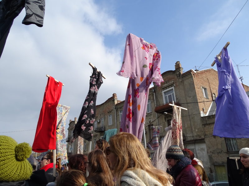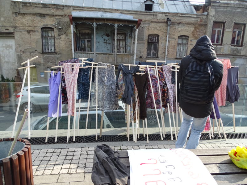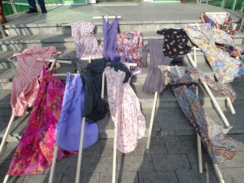აქცია-პერფორმანსის მონაწილეებს ხელში ჯოხზე წამოცმული კაბები ეჭირათ, რაც სიმბოლურად ძალადობის მსხვერპლი ქალების ჩაკარგულ ხმასა და წართმეულ უფლებებს განასახიერებდა.