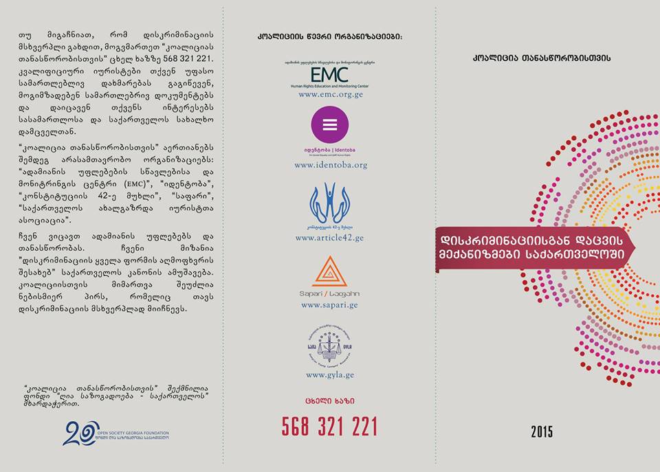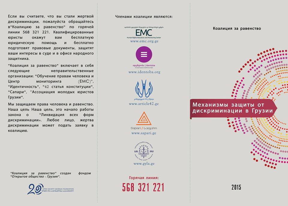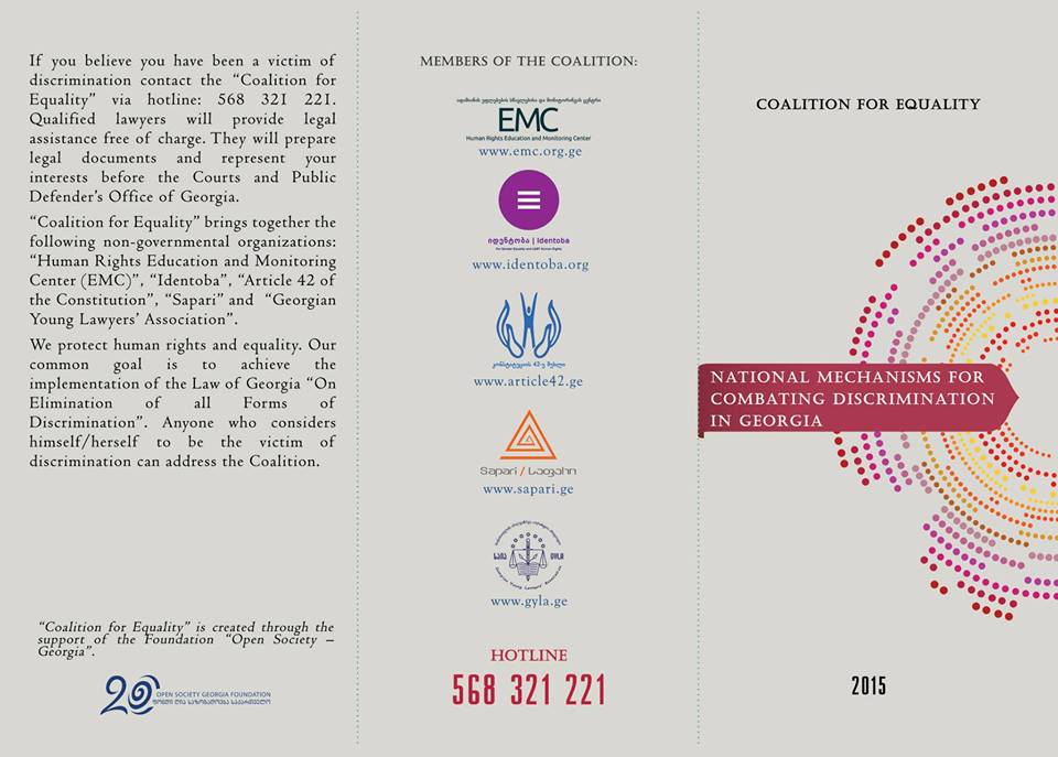 ფონდი “ღია საზოგადოება საქართველოს” მხარდაჭერით შექმნილმა “კოალიციამ თანასწორობისთვის”, რომელიც შემდეგ არასამთავრობო ორგანიზაციებს აერთიანებს: “ახალგაზრდა იურისტთა ასოციაცია”, “ადამიანის უფლებების სწავლებისა და მონიტორინგის ცენტრი”, “საფარი”, “კონსტიტუციის 42-ე მუხლი” და “იდენტობა”, დისკრიმინაციის თემაზე საინფორმაციო ხასიათის მრავალენოვანი ლიფლეტი გამოუშვა.