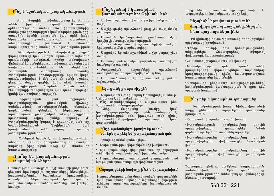 იმისათვის, რომ საქართველოს მოსახლეობას მის გაცნობასთან დაკავშირებით პრობლემები არ შექმნოდა, ლიფლეტი მრავალენოვანია: ქართულ, სომხურ, აზერბაიჯანულ, ინგლისურ და რუსულ ენებზე. მასში საუბარია დისკრიმინაციის არსზე, მის ფორმებზე, მის მექანიზმებზე საქართველოს კანონმდებლობაში, აგრეთვე, დისკრიმინაციის მსხვერპლთათვის მოცემულია საჭირო და სასარგებლო მასალა და ცხელი ხაზის ნომერი, რომელთან დაკავშირებაც დისკრიმინაციის მსხვერპლ მოქალაქეს მუდმივად შეეძლება. ლიფლეტში ჩამოთვლილია დიკსრიმინაციის კონკრეტული მაგალითები, რათა ჩვენი ქვეყნის მოსახლეობას მაქსიმალური ინფორმაცია ჰქონდეს დისკრიმინაციის  რაობის შესახებ.