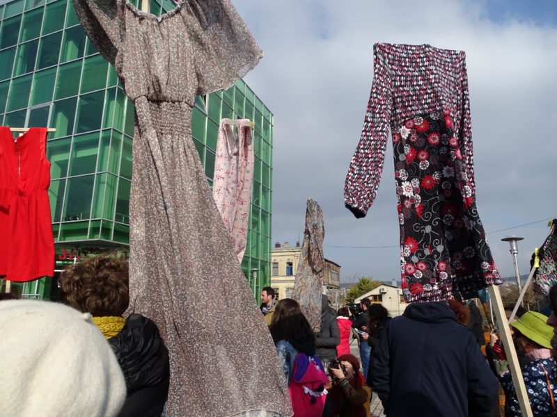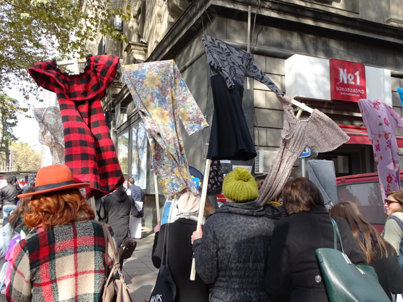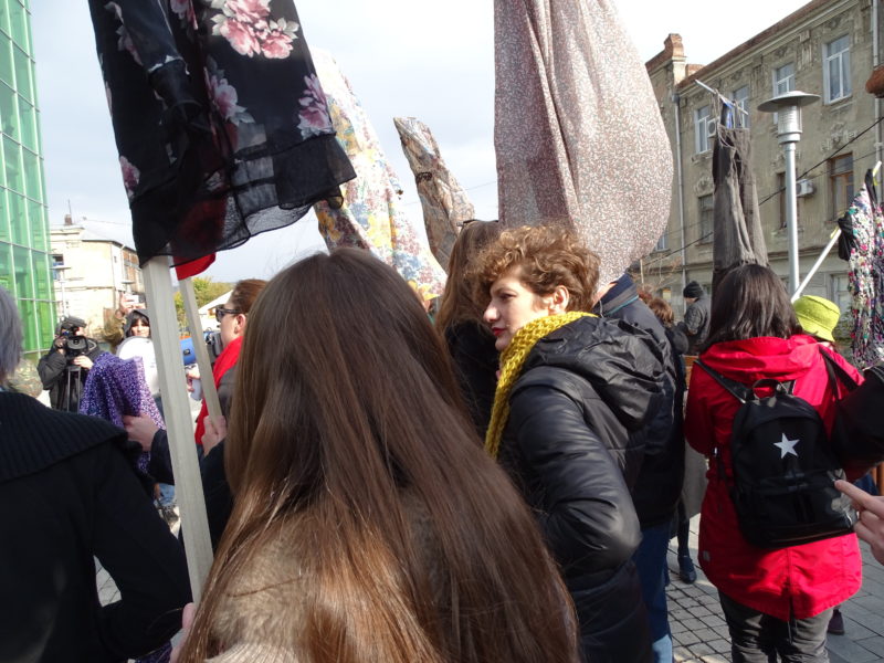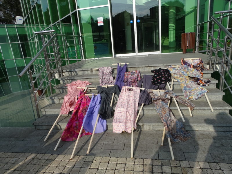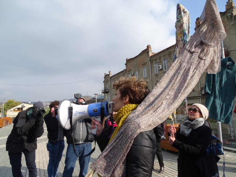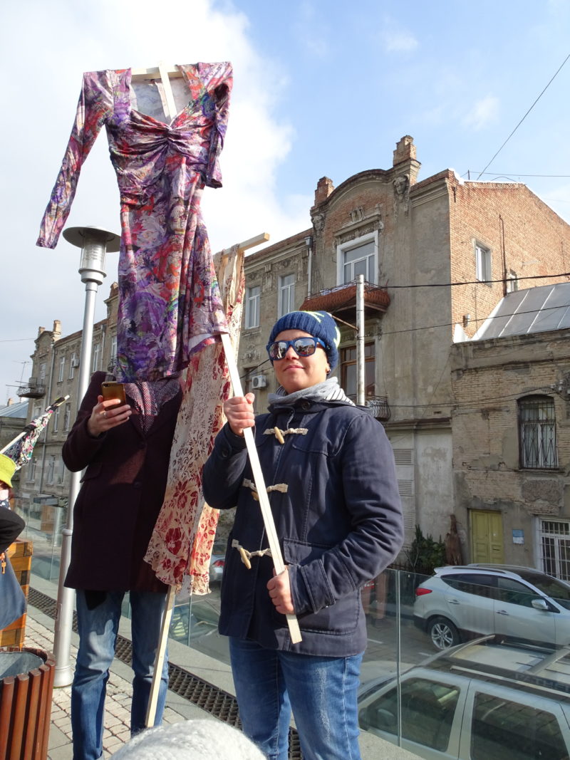 აქცია-პერფორმანსის მონაწილეებს ხელში ჯოხზე წამოცმული კაბები ეჭირათ, რაც სიმბოლურად ძალადობის მსხვერპლი ქალების ჩაკარგულ ხმასა და წართმეულ უფლებებს განასახიერებდა.