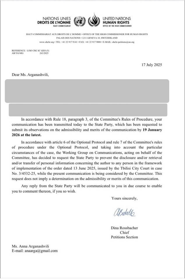 გაეროს ბავშვთა კომიტეტმა (CRC) განიხილა საფარის არასრულწლოვანი ბენეფიციარის მიმართვა საკუთარი უფლებების დასაცავად. კომიტეტმა დააკმაყოფილა ჩვენი მოთხოვნა და საქართველოს მოსთხოვა, რომ არ დაუშვას ბენეფიციარის პირადი ინფორმაციის, გამოთხოვა, გასაჯაროება და გადაცემა ნებისმიერი პირისთვის, მათ შორის ანტიკორუფციული ბიუროსთვის. ამით შეჩერდა 13 ივნისის თბილისის საქალაქო სასამართლოს ბრძანების აღსრულება.
